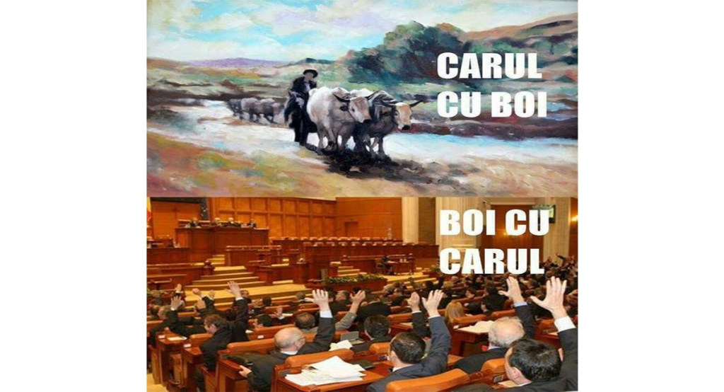 Politica, Râsu Plânsu de 10/13/202020:33 Boi cu carul În parlament sunt mai mulți boi decât sunt într-o fermă de boi. Toți urlă unii la alții care e mai bun. Partajează asta: Partajează prin WhatsApp(Se deschide într-o fereastră nouă) WhatsApp Partajează pe Facebook(Se deschide într-o fereastră nouă) Facebook Partajează pe Reddit(Se deschide într-o fereastră nouă) Reddit Apreciază Încarc... Related