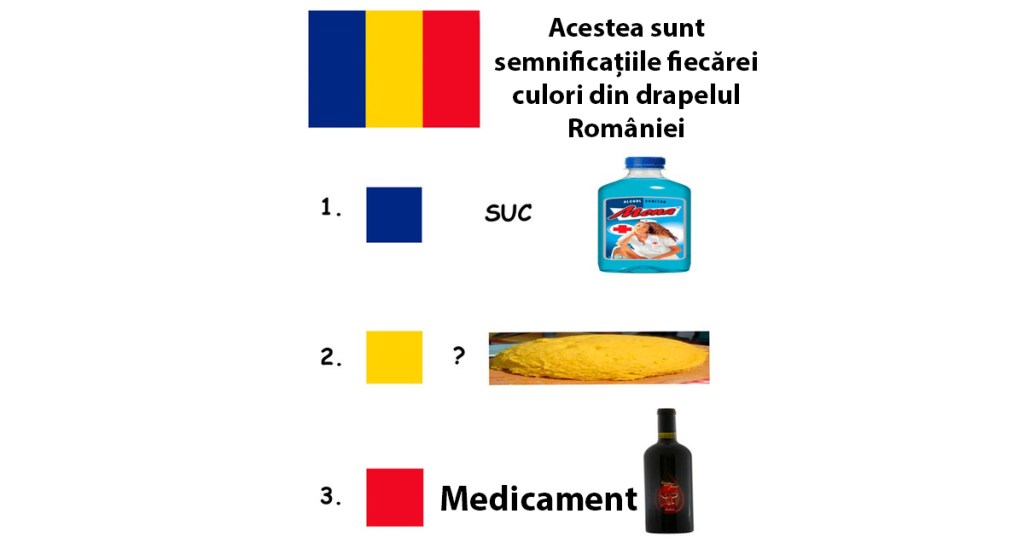 Albastrul de la spirt, galben de la mămăligă, și roșu de la vin sau vișinată. M-ul din „România” vine de la Mona și mămăligă. Câte conexiuni mai există?