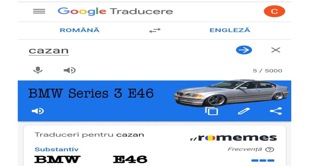 Dacă o să căutați pe google translate traducerea la cuvântul „cazan” o să vă dea ca rezultat un BMW Seria 3 E46 + imagine demonstrativă.