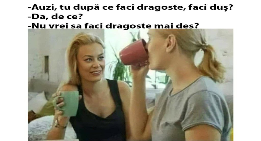 General, Râsu Plânsu de 01/28/202117:03 Duș după dragoste -Tu faci duș după ce faci dragoste? -Da, de ce? -Nu vrei să faci dragoste mai des? Partajează asta: Partajează prin WhatsApp(Se deschide într-o fereastră nouă) WhatsApp Partajează pe Facebook(Se deschide într-o fereastră nouă) Facebook Partajează pe Reddit(Se deschide într-o fereastră nouă) Reddit Apreciază Încarc... Related