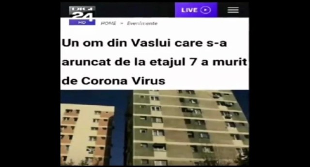 Un om din Vaslui care s-a aruncat de la etajul 7 a murit de Corona Virus. A luat covid-19 de la etajul 5. Dacă s-ar fi vaccinat ar fi supraviețuit căzăturii din cauza mutațiilor genetice.