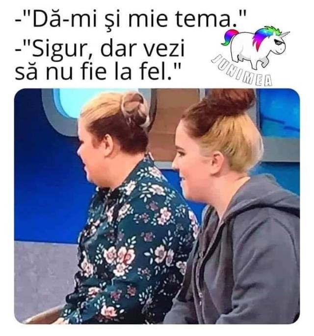 1: Dă-mi și mie tema. 2: Bine, dar să n-o citești!