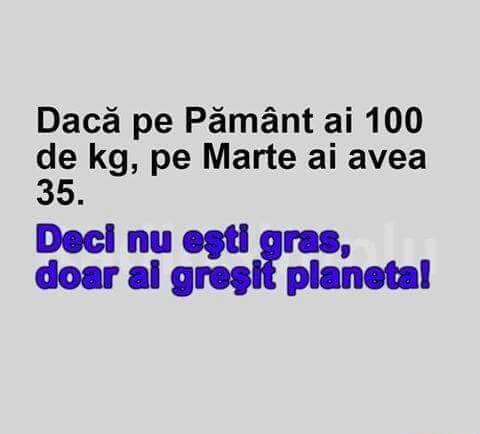 Nu te mai supăra când prietenii îți spun că te-ai îngrășat, argumentează-le ca n-a fost vina ta ca ai ajuns pe Pământ..în alt loc erai mai slab.