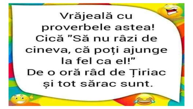 Eu nu mai am încredere în proverbele astea. Cică „Să nu râzi de cineva, că poți ajunge la fel ca el”. Râd de o ora de Țiriac, și nimic…