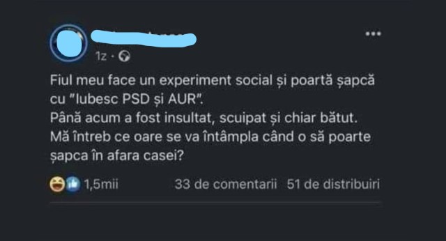 Fiul meu face un experiment social, poartă șapcă cu „Iubesc PSD și AUR”.